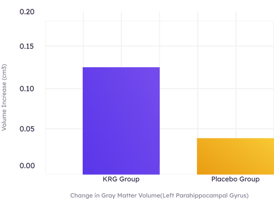 The graph shows a significant increase in the gray matter volume of the left parahippocampal gyrus in the KRG group compared to the placebo group. This suggests that Korean red ginseng supplementation may lead to structural changes in the brain, potentially enhancing cognitive functions related to this brain region.